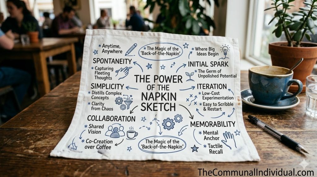 - An entrepreneur sketching a strange business idea on the back of a napkin during a conversation with friends.